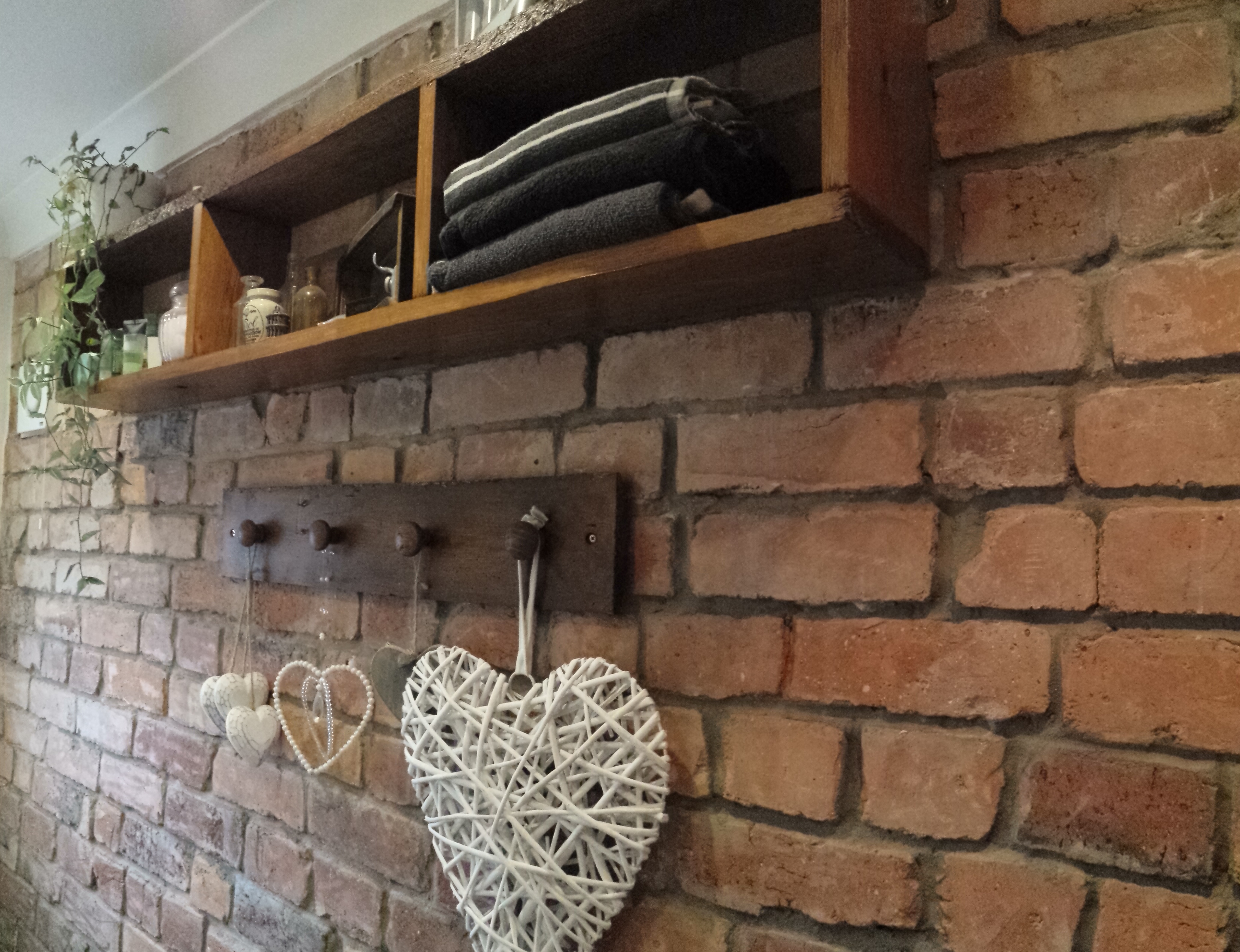 Vintage bathroom design exposed brick wall October 20, 2015October 20, 2015 / Jo Jagiello Vintage bathroom design exposed brick wall with hand made shelves and towel hooks.